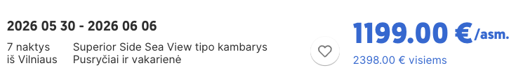 Dėmesio! Nurodyta pasiūlymo kaina galioja vienam asmeniui, gyvenant dviviečiame kambaryje ir būtina žinoti, kad tai yra savarankiška kelionė. Kainos galioja įrašo paskelbimo metu ir gali keistis priklausomai nuo užimtumo. Vietų skaičius gali būti ribotas. Jei mūsų rekomenduojamas viešbutis netinka, užsisakykite viešbučio paieškos paslaugą ir mes rasime geriausią viešbučio kainą.